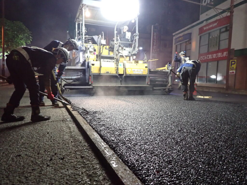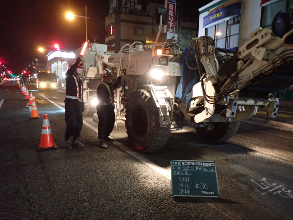 工事内容:今の舗装を取り壊さず、舗装の上部を削り取って整形し、新しい舗装を打設する工事